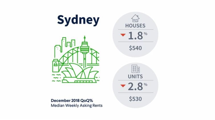 The median Sydney asking price is now $540 a week for houses, down 1.8 per cent in the year ending December 2018, according to the latest Domain Rental Report for the December quarter. Canberra house rents are now higher than the NSW capital, at $560.