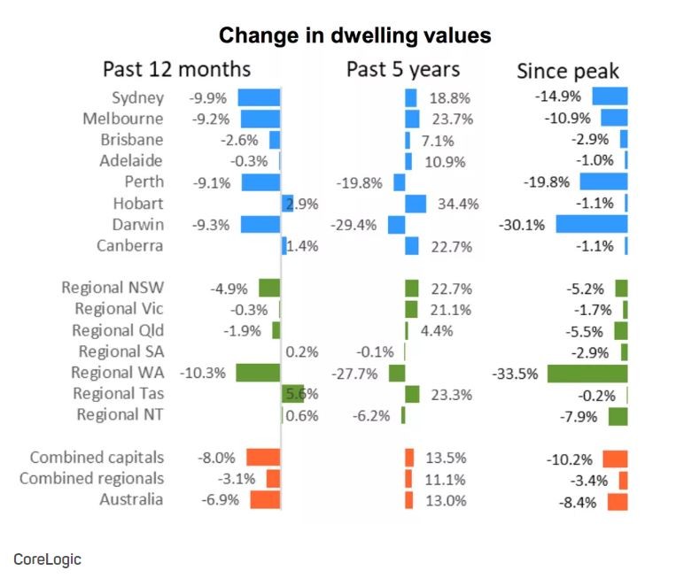 On a quarterly basis, every capital city housing market recorded a drop in value, emphasising the broader geographic scope of the housing market slump.