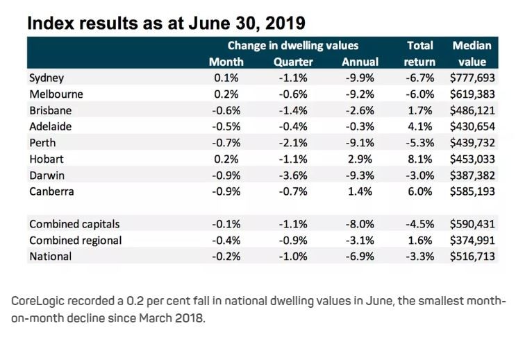 National housing market conditions show a 0.2 per cent fall in June, Corelogic says this is the smallest month-on-month decline in the national series since March last year.